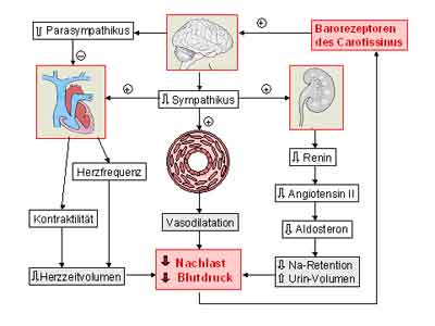 Durch eine elektrische Stimulation der Barorezeptoren (=Pressorrezeptoren) im Carotissinus wird ein „falsch hoher Blutdruck“ simuliert. Über die afferente Nervenleitung wird im Gehirn eine Drosselung der Sympathikusaktivität und Stimulation der Parasympathikusaktivität erreicht. Dies hat folgende Auswirkungen: Senkung des Herzzeitvolumens (durch verminderte Kontraktilität und Herzfrequenz), Suppression des Renin-Angiotensin-Aldosteron-Systems und resultierend auf die renale Ausscheidung von Natrium, Vasodilation der Widerstandsgefässe (wegen verminderter Katecholamin- und Angiotensin-II-Konzentration). Zusammen wird eine effektive BD-Senkung bewirkt. Abbildung angepasst nach [22].