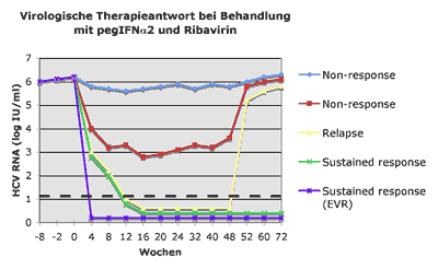 Schematische Darstellung der verschiedenen Gruppen von Therapieantworten. Die gestrichelte schwarze Linie entspricht der Detektionslimite der heutigen, hochempfindlichen Nachweismethoden für HCV-RNA im Blut (15 IU/ml). Von einem «non response» spricht man, wenn die HCV RNA unter der Therapie nachweisbar bleibt. Dabei kann noch zwischen Patienten unterschieden werden, deren HCV-RNA-Wert überhaupt nicht beeinflusst wird durch die Therapie (blau) und solchen, die zwar einen Abfall des HCV-RNA-Wertes zeigen, dieser aber immer über der Test-Nachweisgrenze positiv bleibt (rot). Falls die HCV-RNA während der Therapie unter die Test-Nachweisgrenze abfällt, aber nach Therapieende wieder nachweisbar wird, spricht man von einem «relapse» (gelb). Patienten, die auch 6 Monate nach Therapieende immer noch keine nachweisbare HCV-RNA haben, sind nach heutigem Wissensstand geheilt. Man spricht dabei von einem «sustained response». Dabei kann noch zwischen Patienten unterschieden werden, deren HCV-RNA-Wert schon nach den ersten 4 Behandlungswochen negativ ist (early virological response, EVR, violett) und solchen, die erst später HCV-RNA-negativ werden (grün). | |