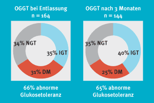 Bei Spitalentlassung wiesen 66% eine abnorme Glukosetoleranz auf und nach 3 Monaten waren es 65%.