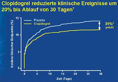 In dieser Studie konnte gezeigt werden, dass der Zusatz von Clopidogrel die Ergebnisse der Fibrinolyse beim STEMI verbessert. Clopidogrel ist zwar als Thrombozyten-Inhibitor schwächer als die GPIIb/IIIa-Antagonisten, aber offenbar in der Gratwanderung zwischen offen halten der Koronarie und Blutungsrisiko eine gangbare Lösung – und das zu einem deutlich geringeren Preis (NNT 16).