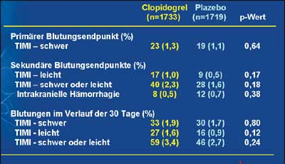 3’283 Patienten (94%) erhielten eine Koronarangiografie. Die Ergebnisse der Studie waren erfreulich: Die zusätzliche Therapie mit Clopidogrel konnte den primären Endpunkt – ein noch oder schon wieder verschlossenes Gefäss, Tod oder ein Infarktrezidiv – von 21,7% auf 15,0% senken, was einer absoluten Reduktion um 6,7% und einer hochsignifikanten relativen Risikoreduktion von 36% (95% CI, 24-47%); p < 0.001) bedeutet. Zudem reduzierte Clopidogrel die Rate an klinischen Ereignissen wie kardiovaskulärer Tod, Infarktrezidiv oder Notfallrevaskularisierung nach 30 Tage signifikant um 20% (11,6 vs.14,1%; p = 0.03). Die TIMI-Flussparameter verbesserten sich ebenfalls signifikant um 36% (p < 0.001). Die Blutungsrate, der primäre Endpunkt für die Sicherheit, war bei Clopidogrel nicht erhöht. Diese Rate lag bei beiden Therapien zwischen 1% und 2%. Nicht gesenkt wurde der wichtigste Endpunkt: die Mortalität.