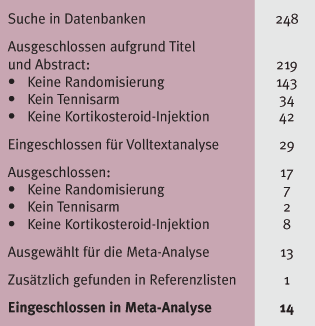 Insgesamt wurden 29 Studien identifiziert, wovon 14 den Einschlusskriterien genügten. Davon verglichen 2 Studien Kortikosteroid-Injektion mit Placebo (NaCl-Injektion), 3 Studien mit Lokalanästhesie und 5 Studien mit konservativer Therapie. Mittelfristige und langfristige Effekte wurden in 6 Studien gemessen.