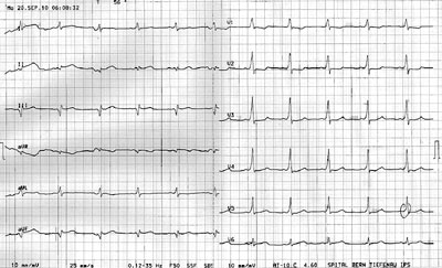 Der Patient erhält Amiodarone 300 mg iv, worauf es zur Konversion in einen Sinusrhythmus kommt. Das EKG danach sieht so aus (dieses EKG wurde 3 Tage später aufgezeichnet):