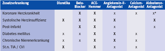 x: als erste Wahl, x: als "gute Alternative oder Ergänzung zur ersten Wahl, * bei eingeschränkter systolischer LV-Funktion und/oder Herzinsuffizienz