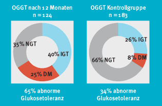 Nach 12 Monate lag die Prävalenz für eine verminderte Glukosetoleranz unverändert hoch bei 65%. Im Vergleich dazu wiesen in einer Kontrollgruppe von anderen Patienten aus der Coronary Care Unit nur 34% eine pathologische Glukosetoleranz auf.