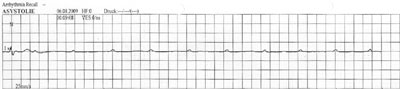 Der AV-Block mit einem Ersatzhythmus um 36/min. ist symptomatisch; der Ersatzrhythmus ist