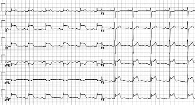 Der Patient wird mit der Diagnose einer akuten Perikarditis symptomatisch mit NSAR behandelt. 2 Tage später hat er nachts wieder starke Retrosternalschmerzen mit Ausstrahlung zwischen die Schulterblätter. Es wird wieder ein EKG geschrieben. Zudem ist das Troponin-T mit 3.8 µg/l stark erhöht.