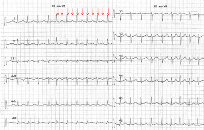 Das initiale EKG ist zwar arrhythmisch, es zeigt sich allerdings bei genauerem Hinsehen eine regelmässige Vorhofsaktion mit einer atrialen Frequenz von 200/min (EKG 3).