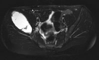 Die Röntgenuntersuchung von Becken/Hüfte zeigt eine septierte geographische Osteolyse in der Ala und im Korpus des Os Iliums rechts. Das Röntgenbild und die Aufnahmen der nachfolgenden MRI-Untersuchung sehen Sie hier: