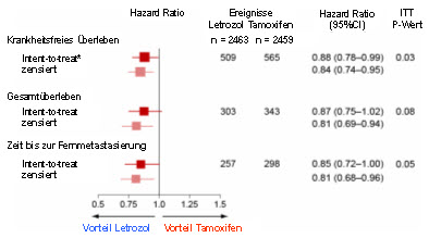 Das krankheitsfreie sowie das fernmetastasenfreie Überleben waren unter Letrozol in beiden Analysen signifikant besser. Die Gesamtmortalität war in der Letrozolgruppe um 13% (ITT-Analyse, p=0.08) respektive 19% (zensierte Analyse, deswegen ohne p-Wert-Angabe) geringer als in der Tamoxifengruppe. Die Überlegenheit von Letrozol war unabhängig vom Progesteronrezeptor- und HER2-Status, am ausgeprägtesten bei hoher Proliferationsaktivität (Ki67 hoch).