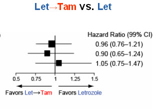 Zwischen den Therapieschemata Letrozol-Monotherapie und Letrozl gefolgt von Tamoxifen waren keine Unterschiede nachweisbar. Die Letrozol Monotherapie schien gegenüber Tamoxifen gefolgt von Letrozol leichte Vorteile zu zeigen, die Unterschiede im Überleben waren aber statistisch nicht signifikant. Weniger Brustkrebsereignisse unter Letrozol Monotherapie traten bei diesem Vergleich vor allem bei Frauen mit positivem Nodalstatus auf. Die Konklusion der Studienautoren aus diesen Resultaten: Die Sequenztherapie verbessert das Überleben im Vergleich zur Letrozol-Monotherapie nicht. Wird dennoch eine adjuvante Sequenztherapie erwogen, sollte mit Letrozol begonnen werden.