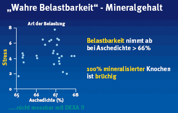 Je nach Lokalisation sind die Anforderungen und daher auch die Strukturen des Knochens unterschiedlich. Die Belastbarkeit des Knochens durch äussere Einwirkungen (Stress) nimmt nur bis zu einer Knochenmasse von 66% zu, um dann drastisch abzunehmen (Abb. 2). Bei solchen Patienten gaukeln zunehmende Bone-Mineral-Densitiy-(BMD-)Werte aus der DXA-Messung Arzt und Patienten eine Sicherheit vor, die nicht gegeben ist.